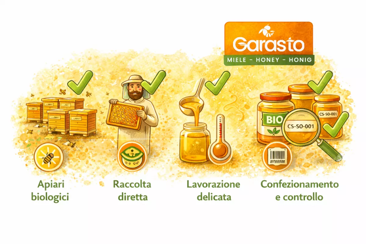 - Produzione 100% interna: dalla cura delle api al confezionamento