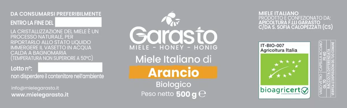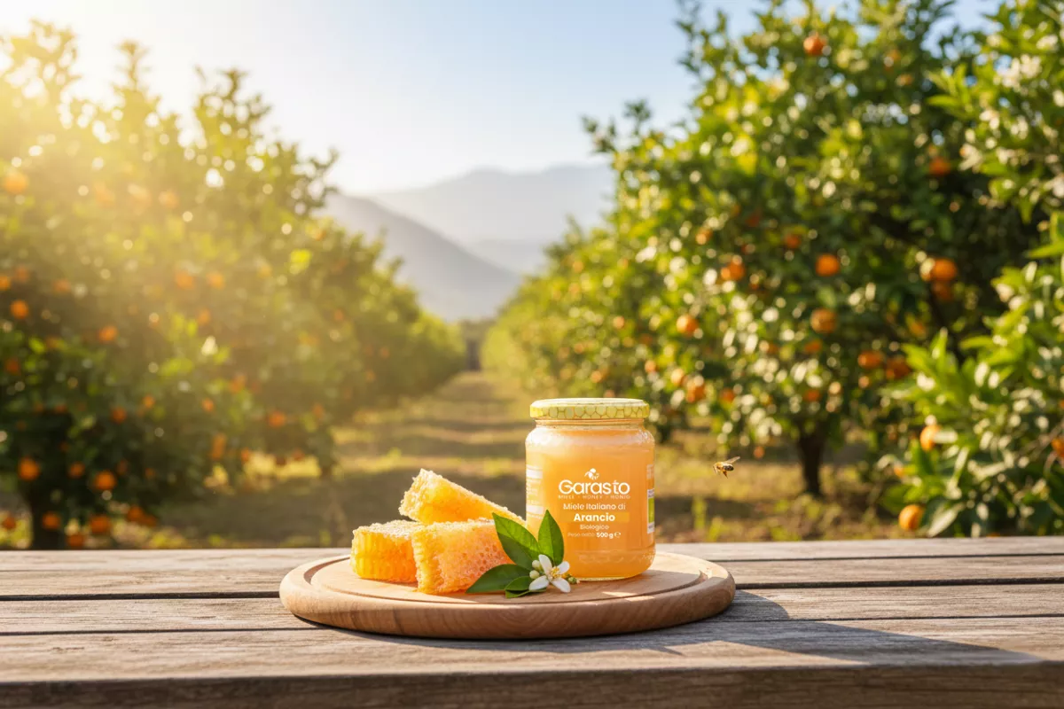 Il Miele di Arancio Biologico prodotto dall'Apicoltura Fratelli Garasto nasce dalla fioritura degli agrumeti della Piana di Sibari. È un miele chiaro, aromatico e avvolgente, non pastorizzato e lavorato a bassa temperatura per preservarne profumo e qualità naturali.